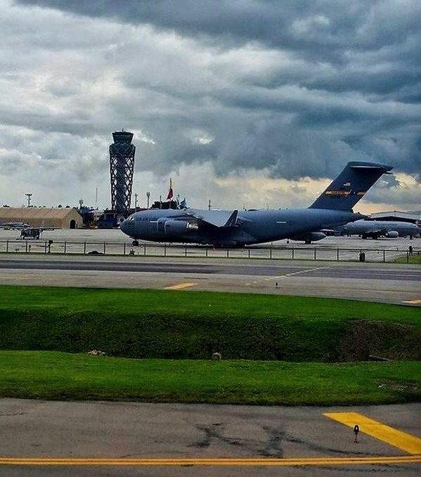 Ảnh máy bay vận tải C17 của Hoa Kỳ hạ cánh xuống Colombia sáng 4-2-2019.