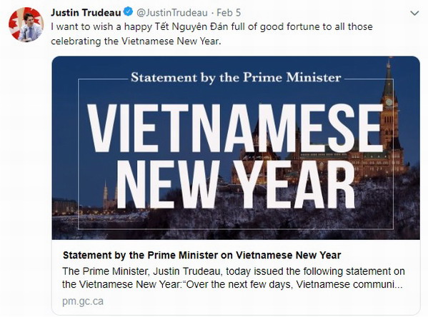 “Tết là thời gian để suy ngẫm về năm qua, mừng những khởi đầu mới và chờ đón mùa Xuân sắp đến. Để chào đón năm Kỷ Hợi, các gia đình và thân hữu sẽ cùng nhau thưởng thức những món ăn trong ngày lễ đặc biệt và gửi những lời chúc tốt đẹp nhất về vận may trong năm tới”, thông cáo từ Văn phòng Thủ tướng Trudeau viết.