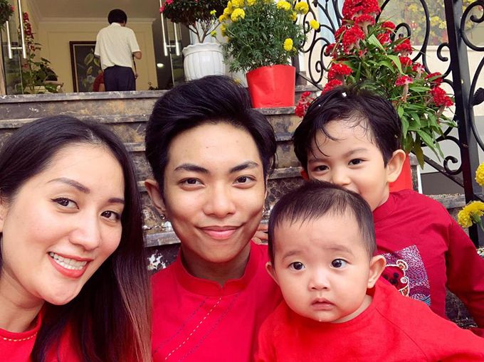 Gia đình Khánh Thi diện áo dài đỏ rực rỡ đón năm mới nhiều may mắn tốt lành.