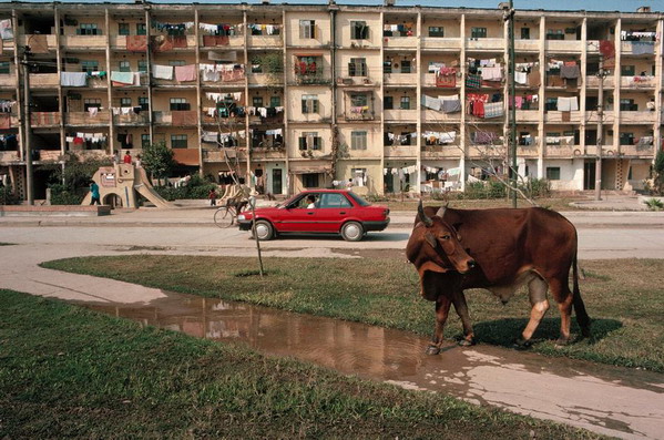 Bò chạy rông trên bờ hồ Giảng Võ, phía trước nhà B1 của khu tập thể "cao cấp" Giảng Võ, Hà Nội.