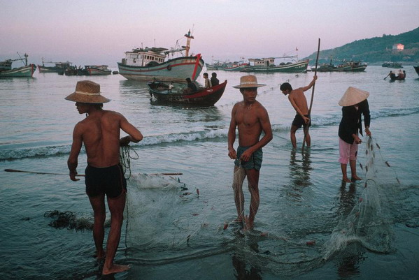 Người dân chài thu lưới trên bờ biển Vũng Tàu.
