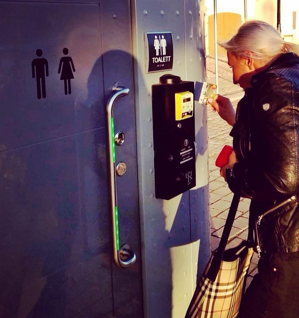 Trong những năm gần đây, lượng tiền mặt trong lưu thông đã nhanh chóng giảm ở Thụy Điển. Ngay cả nhà vệ sinh công cộng cũng chấp nhận thanh toán bằng thẻ tín dụng. Đèn LED được lắp đặt trên tay nắm cửa của nhà vệ sinh công cộng, màu đỏ báo hiệu rằng có người đang sử dụng, trong khi màu xanh lá cây là đang trống.