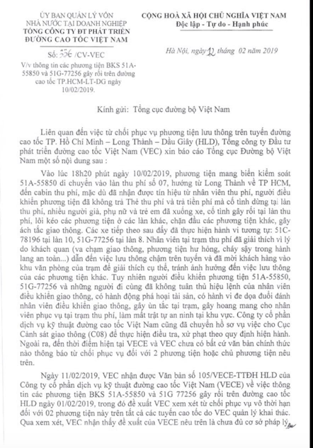 Cũng trong chiều cùng ngày, VEC tiếp tục gửi văn bản số 336 tới Tổng cục Đường bộ Việt Nam báo cáo về thông tin các phương tiện BKS: 51A-55850 và 51G-77256 gây rối trên đường cao tốc TP.HCM – Long Thành – Dầu Giây vào ngày 10/2,