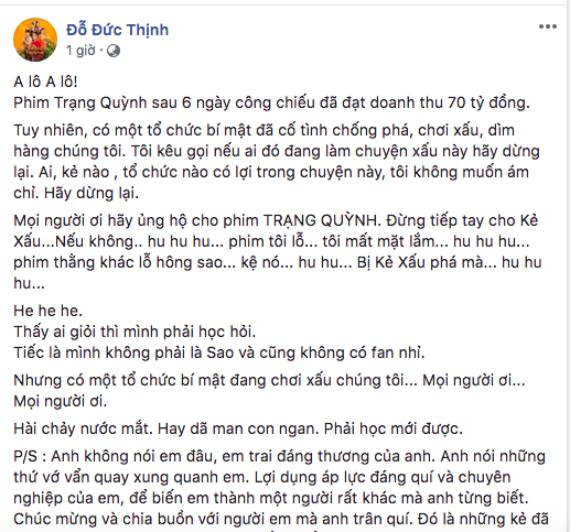 Những dòng mai mỉa, châm biếm đầy hằn học và không hề thuyết phục của Đức Thịnh đang đặt dấu chấm hết cho cuộc chiến anh tự mở màn.