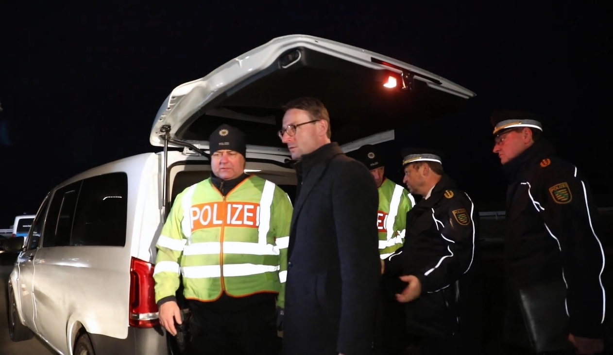 Bộ trưởng Bộ Nội vụ bang Sachsen thị sát trạm kiểm tra tại đường xa lộ A1, bãi đỗ „Am Heidenholz“.( Ảnh: Bundespolizei)