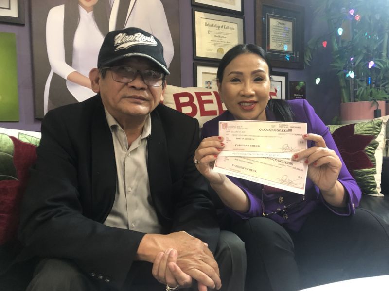 Bà Trần Kim Vân ngồi cạnh ông Toàn Nguyễn sau khi nhận hai tờ check đầu tiên.