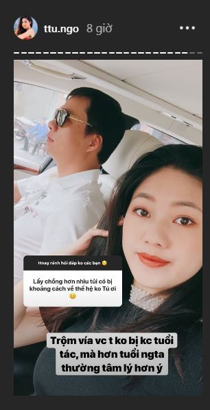 Mới đây, trên trang cá nhân của mình, Á hậu Thanh Tú đã có phần trả lời những câu hỏi của người hâm mộ trên instagram. Khi được hỏi: "Lấy chồng hơn nhiều tuổi có bị khoảng cách về thế hệ không Tú ơi". Á hậu Thanh Tú chia sẻ: "Trộm vía, vợ chồng tớ không bị khoảng cách tuổi tác, mà hơn tuổi người ta thường tâm lý hơn ý".