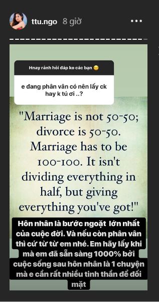 Ngoài ra, có một cư dân mạng phân vân có nên lấy chồng hay không, Thanh Tú cũng đưa ra lời khuyên: "Hôn nhân là bước ngoặt lớn nhất của cuộc đời. Và nếu còn phân vân thì cứ từ từ em nhé. Em hãy lấy khi mà em sẵn sàng 100% bởi cuộc sống sau hôn nhân là một chuyện mà em rất cần nhiều tinh thần để đối mặt".