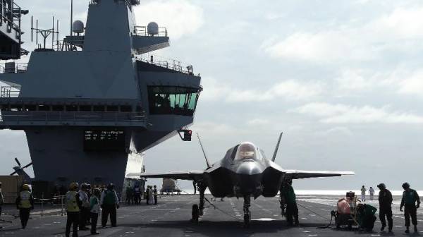 Một chiếc F-35B thế hệ mới chuẩn bị cất cánh trên tàu sân bay HMS Queen Elizabeth của . Hệ thống tác chiến điện tử cho phép F-35 của nhiều nước đồng minh cùng hiệp đồng tác chiến. Ảnh: Getty.