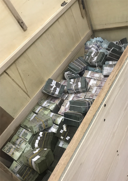 Số tiền lớn Nam khai giấu ở nhà bạn ở Quảng Ninh, ban đầu cơ quan điều tra còn chưa tin vì sao có thể để hớ hênh như thế. Dẫn các trinh sát tới nơi, gia chủ lúc này mới hay hai thùng đồ Nam gửi nhờ chính là thùng tiền. Trong nhà kho không có khóa cửa, ở xó nhà có hai thùng (cao 80 cm, dài hơn 2 m, rộng 80 cm) được che bạt. Cậy nắp thùng, bên trong chất các cọc tiền cao tới 40 cm.