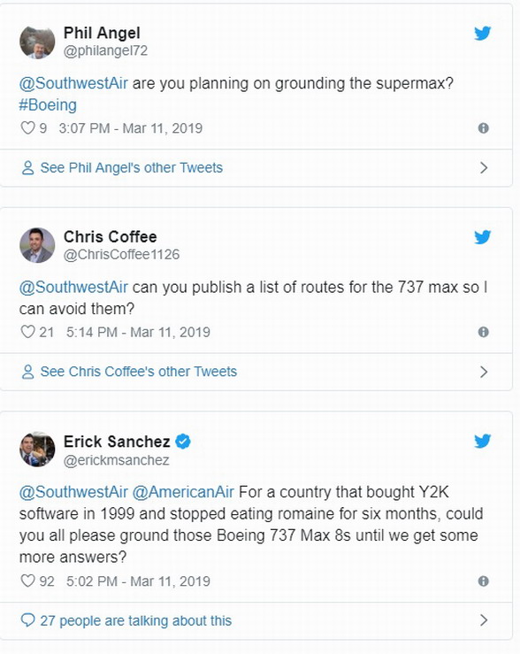 Người phát ngôn của Southwest Brian Parrish cho biết họ đang "trả lời một số câu hỏi" từ khách hàng hỏi liệu họ bị đặt trên máy bay 737 MAX 8 không. Brian Parrish nói rằng hãng đã trả lời riêng cho từng khách hàng và hãy "vẫn tin tưởng vào sự an toàn và khả năng không vận của đội bay gồm hơn 750 máy bay Boeing của chúng tôi".