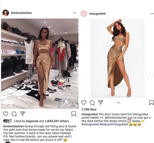 Cũng theo Diet Prada, các thương hiệu thời trang nhanh như Missguided hay Fashion Nova đều có cả một mảng riêng chuyên nhái lại các thiết kế mà Kim Kardashian hay Kylie Jenner đã mặc, song đó không hoàn toàn là sự ngẫu nhiên mà có thể có chủ đích từ cả hai phía.