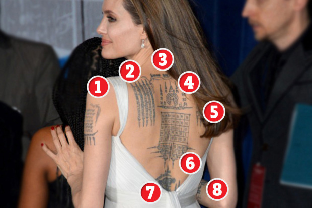 Các hình xăm trên lưng của Angelina Jolie đều mang tính biểu tượng, hầu hết là gửi gắm tình yêu của nữ diễn viên với 6 người con và Brad Pitt. Đặc biệt hình xăm lớn nhất giữa lưng mang ý nghĩa bùa phép thể hiện cho sự gắn kết thiêng liêng với Brad.