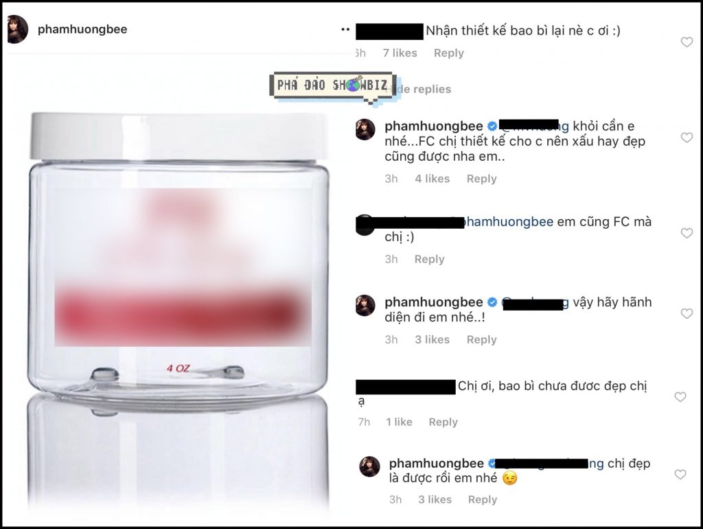 Bên cạnh những bình luận bày tỏ sự tò mò, chờ đợi về sản phẩm đầu tiên khi lấn sân sang kinh doanh của Phạm Hương, số khác lại thẳng thắn đóng góp ý kiến khi cho rằng, thiết kế sản phẩm của “Hoa hậu quốc dân” không sang trọng và kém bắt mắt. “Nhân thiết kế bao bì lại nè chị ơi”, “Chị ơi, bao bì chưa được đẹp”… – fan của Phạm Hương thẳng thắn để lại ý kiến. Ngay sau đó, Phạm Hương không ngần ngại đáp trả, kể cả đó là fan của mình: “Khỏi cần em nhé, FC chị thiết kế cho chị nên xấu hay đẹp cũng được nha em”, “Chị đẹp là được rồi em nhé”…