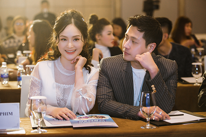 Lan Phương và bạn diễn Thanh Sơn tại buổi họp báo ra mắt 'Nàng dâu order' chiều ngày 18/3.