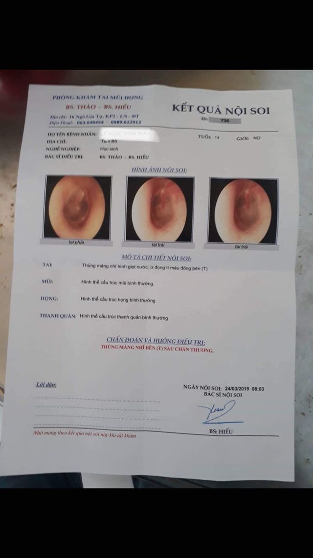 Sau khi bị các bạn đánh cháu T. kêu chóng mặt, ù tai nên gia đình đã đưa cháu đi khám, các bác sỹ kết luận cháu bị thủng màng nhĩ bên trái.