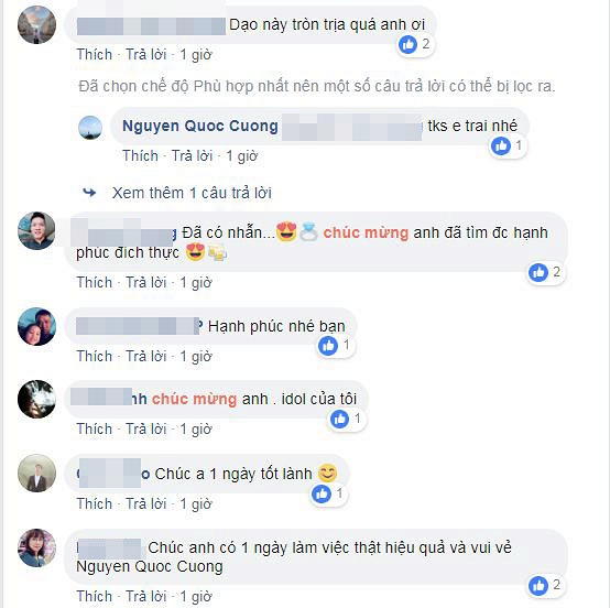 "Trang chăm chồng giỏi quá. Cường béo nhìn đẹp trai lắm", "Dạo này tròn trịa quá anh ơi", "Cường có Trang, dạo này mặt đầy đặn ra thấy rõ. Đừng để "phúc hậu" quá hết đẹp trai nhé em", "Có vợ về thấy trẻ hơn rồi", "Anh Cường béo đẹp hẳn ra", "Chúc mừng hai em, hai em sinh ra là để cho nhau đấy", "Anh chị có tướng phu thê ghê"... hàng loạt dân mạng nhận xét.Sau một thời gian dài hẹn hò, Cường Đô la và Đàm Thu Trang đã tổ chức đám hỏi vào 20/1/2019. Được biết, cả hai đã chung sống cùng một nhà. Có thể thấy, sau nhiều cuộc tình đầy ồn ào, Cường Đô la đã tìm được tình yêu đích thực của cuộc đời mình. Mối quan hệ của cặp đôi không chỉ được gia đình hai bên đồng ý mà còn được công chúng ủng hộ hết mình.