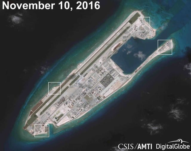 Ảnh vệ tinh chụp ngày 10/11/2016 cho thấy các tổ hợp được cho là vũ khí do Trung Quốc triển khai trái phép trên đá Chữ Thập tại quần đảo Trường Sa của Việt Nam. (Ảnh: CSIS/AMTI)