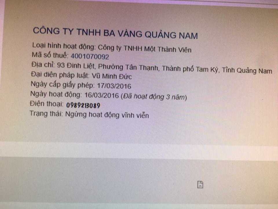 Theo hồ sơ, Công ty TNHH Ba Vàng Quảng Nam (mã số thuế: 4001070092) được cấp phép ngày 17.3.2016. Nơi đăng ký quản lý là Chi cục Thuế TP.Tam Kỳ (Quảng Nam), trụ sở 93 Đinh Liệt (phường Tân Thạnh, thành phố Tam Kỳ, Quảng Nam). Nghề nghiệp đăng ký kinh doanh của công ty này là xây dựng công trình kỹ thuật dân dụng khác (ngành chính); phá dỡ; chuẩn bị mặt bằng; lắp đặt hệ thống xây dựng khác; vận tải hành khách đường bộ khác; vận tải hàng hóa bằng đường bộ; nhà hàng và các dịch vụ ăn uống phục vụ lưu động; hoạt động tư vấn quản lý; hoạt động kiến trúc và tư vấn kỹ thuật có liên quan; cho thuê xe có động cơ; tổ chức giới thiệu và xúc tiến thương mại; đại lý du lịch; điều hành tour du lịch; dịch vụ hỗ trợ liên quan đến quảng bá và tổ chức tour du lịch.