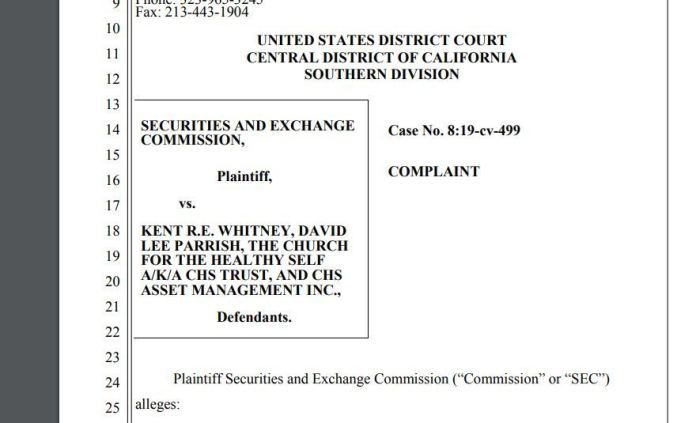 Đơn kiện của SEC nói rằng, ông Kent R.E. Whitney, 37 tuổi, cư dân Newport Beach, tự xưng là mục sư sáng lập “nhà thờ” Church for the Healthy Self hồi năm 2014, chỉ ba tháng sau khi ông mãn hạn 44 tháng tù vì tội lừa đảo hơn $600,000 của 10 nhà đầu tư, một phần trong âm mưu lừa đảo tới $96 triệu.