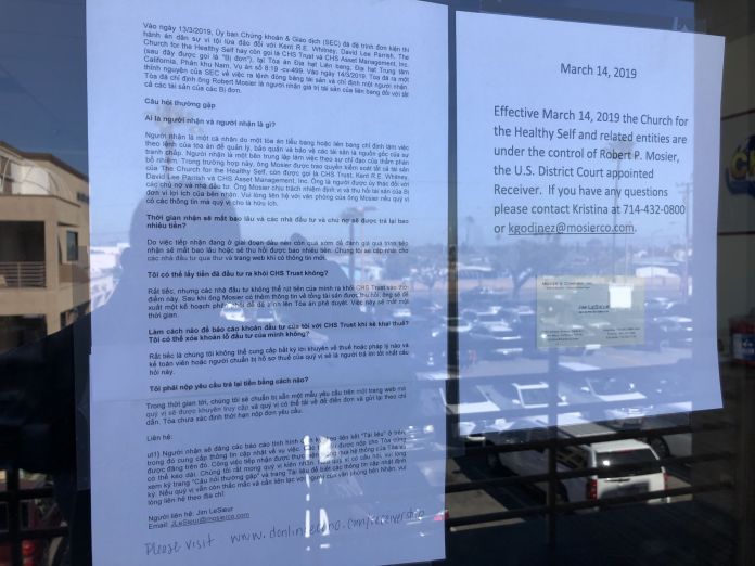 Một thông báo của ông Jim LeSieur, một giám đốc của Mosier & Company, Inc., cho biết: “Kể từ ngày 14 Tháng Ba, 2019, Church for the Healthy Self và tất cả thực thể liên quan, đều do ông Robert P. Mosier kiểm soát. Ông là người được tòa liên bang chỉ định quản lý tài sản này. Mọi thắc mắc, xin liên lạc Kristina tại số 714-432-0800 hoặc email
