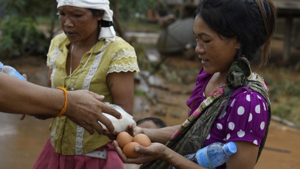 Một nạn nhân lũ lụt ở tỉnh Attapeu nhận đồ cứu trợ hôm 27/07/2018.