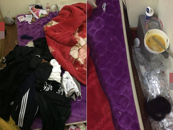 Căn phòng bề bộn như bãi rác bỏ hoang với đống quần áo, rác rưởi để vương vãi dưới sàn nhà. Nhiều hộp thức ăn mốc meo chưa được thu dọn. Trong phòng còn có 3 chú mèo gây trơ xương vì bị bỏ đói 1 tháng trời. Chủ nhà vừa bị “bùng” tiền trọ 1 tháng vừa phải dọn dẹp “bãi rác thải” nên rất bức xúc.