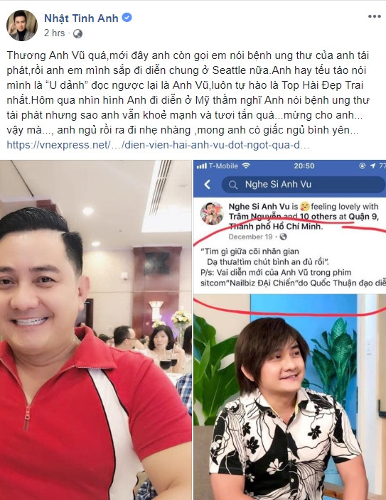 Diễn viên Trung Dũng bình luận ở Facebook Kha Ly: “Trời ơi, anh không tin Ly ơi, anh gặp Vũ tập (gym) hàng tuần, nhìn rất khỏe, vậy mà bây giờ.”