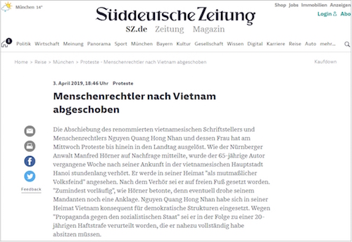 Sau khi nhà hoạt động nhân quyền Nguyễn Quang Hồng Nhân và vợ bị Đức trục xuất về Việt Nam, nơi mà ông từng bị kết án và ngồi tù gần 20 năm trời với cáo buộc „hoạt động tuyên truyền chống phá cách mạng“, thì các tổ chức xã hội dân sự như Flüchtlingsrat Nürnberg, AK Asyl, Pro Asyl v.v. và các đảng phái đối lập tại bang Bayern đã được “báo động” về vụ trục xuất này. Đặc biệt là bài báo của nữ ký giả Marina Mai trên tờ TAZ ngày 01/04/2019 đã đánh động công luận, ngay sau đó các báo chí truyền thông bang Bayern đã chú ý và đưa tin về vụ việc này. Không chỉ báo chí địa phương, mà cả tờ Süddeutsche Zeitung, một nhật báo có tầm vóc liên bang, trong số ra hôm nay 03/04/2019 cũng có bài tường thuật về vụ trục xuất này.