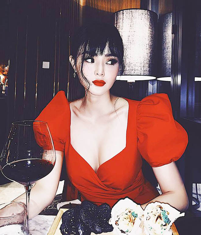 Phương Trang nổi bật với màu son môi đỏ chót khi đi ăn tiệc.