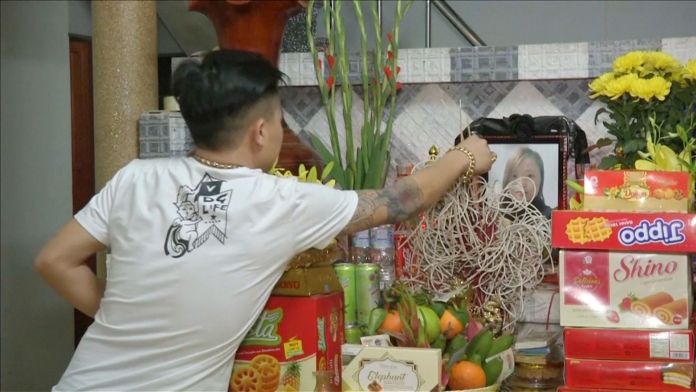 Anh Vu Ngoc Thuy thắp nhang cho vợ, chị Nguyễn Thị Trang. (Hình: Reuters)