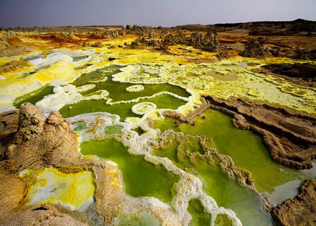 Hồ Danakil: Đây không phải là bể bơi bình thường, đây thực sự là những hồ axit với lớp vỏ giòn của muối và lưu huỳnh. Hoàn toàn là một trong những nơi kỳ lạ nhất trên trái đất.