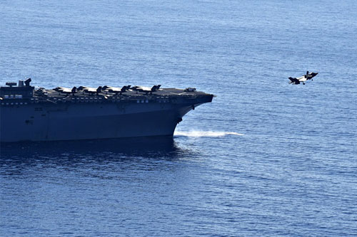 Các tiêm kích cất hạ cánh từ tàu đổ bộ cỡ lớn của Mỹ khi di chuyển gần bãi cạn Scarborough, Biển Đông, phóng viên Philippines cho biết.