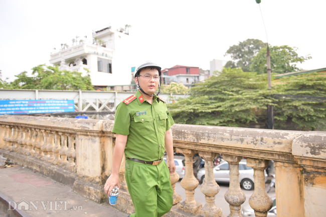 Các chiến sĩ dọn kim tiêm tại lối lên cầu Long Biên.