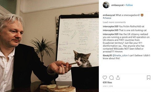Ông chủ của WikiLeaks đã sống gần 7 năm tại đại sứ quán của đất nước Nam Mỹ. Vào năm 2016, Assange nhận nuôi một con mèo để có người bầu bạn và thường xuyên đăng ảnh chụp cùng thú cưng lên mạng xã hội Twitter và Instagram dưới tài khoản @Embassy Cat (Chú mèo Sứ quán). Các tài khoản này dừng cập nhật ảnh kể từ năm 2017.Năm 2018, đại sứ quán Ecuador đề nghị ông Assange tuân theo nội quy mới trong bản ghi nhớ dài 9 trang, theo đó, ông chủ của WikiLeaks phải tự trả chi phí chăm nuôi con con mèo đồng thời dọn dẹp sạch sẽ phòng tắm, chăm sóc tốt hơn cho con thú cưng.
