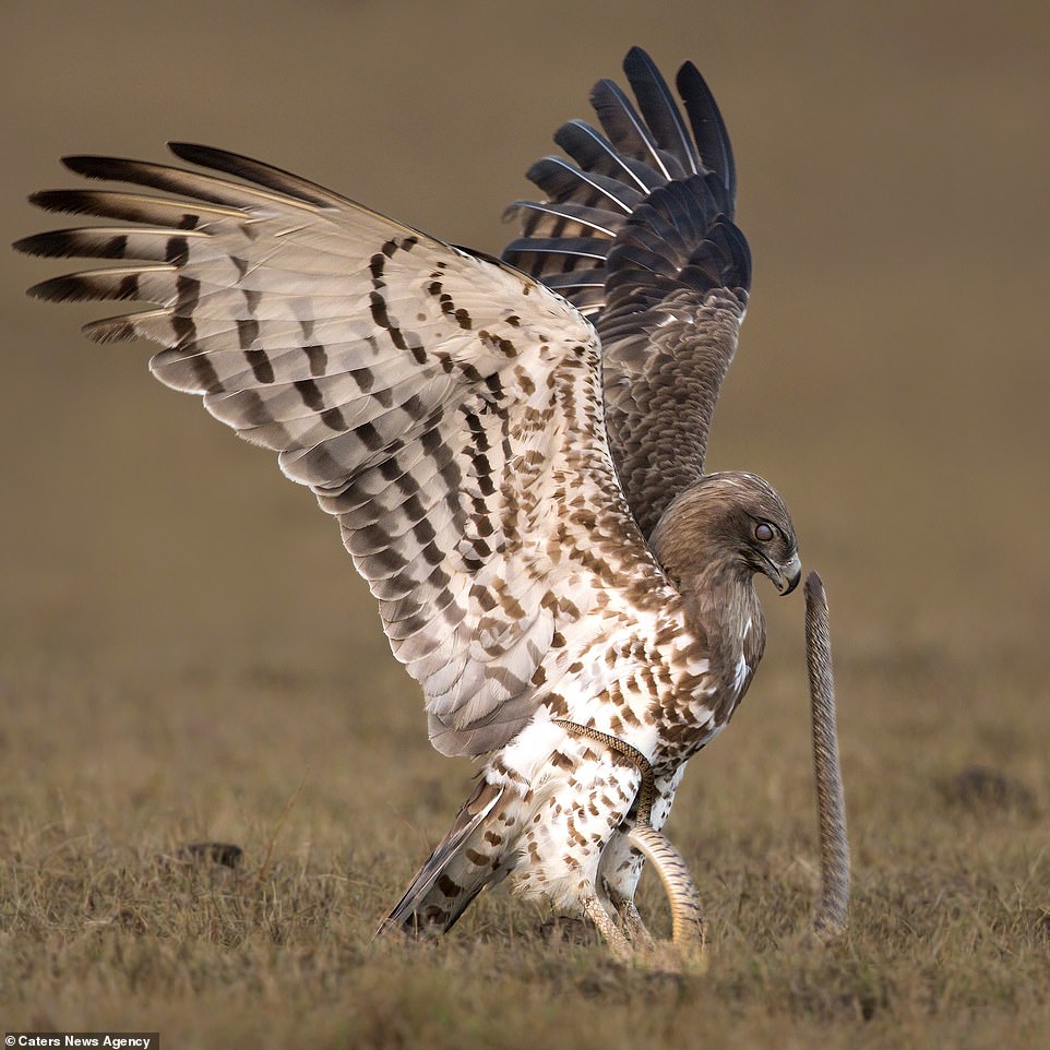 Chim đại bàng phải nhảy lên khỏi mặt đất để tránh đòn quăng mình tấn công của rắn chuột.