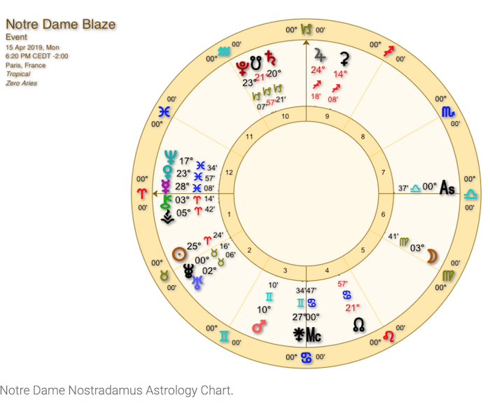 Theo giải thích của Jessica Adams: “Những gì chúng ta có ở đây là Chiron [Cung Thủ – nhân vật trong Thần thoại Hy Lạp và là một tiểu hành tinh Nhân Mã – thuộc nguyên tố lửa], ở phía trên cung Bạch Dương [cũng thuộc nguyên tố lửa] – chỉ ở ba độ của cung hoàng đạo. Mặt trời, màu cam cháy vào lúc hoàng hôn ở Paris khi Đức Bà ngã xuống – cũng ở cung Bạch Dương – trong biểu đồ chiêm tinh được thiết lập vào thứ Hai 15/4/2019 lúc 17h50 chiều, Paris, Pháp”.
