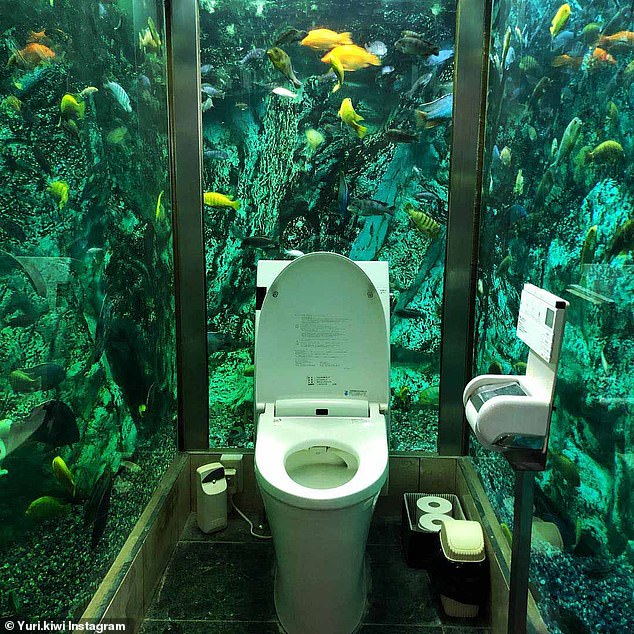 Toilet với 3 bề là bể cá cảnh tại quán cà phê Nhật Bản.