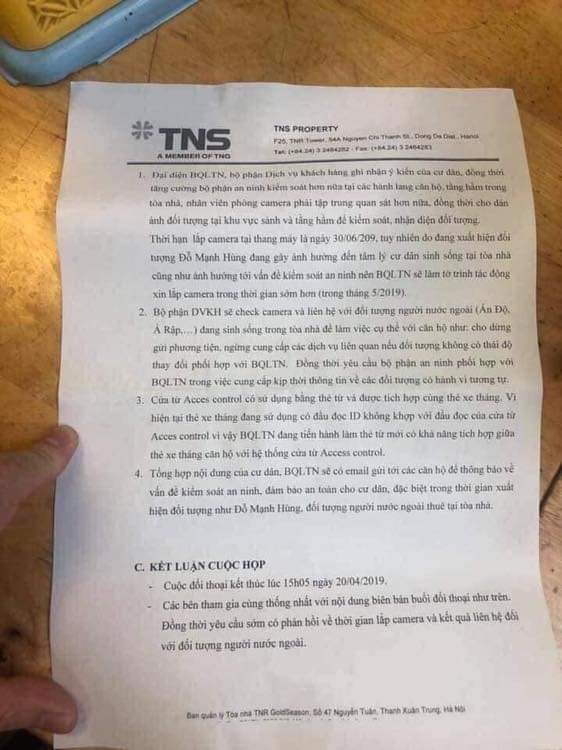 Ảnh : Nội dung biên bản họp giữa BQL toà nhà và cư dân Goldseason về vụ việc liên quan đến Đỗ Mạnh Hùng.