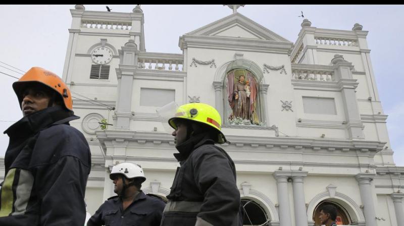 Lính cứu hỏa Sri Lanka đứng ở khu vực xung quanh đền thờ Thánh Anthony sau vụ nổ ở thủ đô Colombo, Sri Lanka.