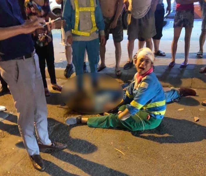 Chứng kiến sự ra đi đột ngột của đồng nghiệp, một nữ công nhân môi trường ngồi sõng soài xuống đất, gào khóc bên cạnh thi thể nạn nhân xấu số.