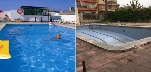 Bể bơi của khách sạn khi quảng cáo trên mạng (trái) và ngoài đời thực. Ảnh: Sun.