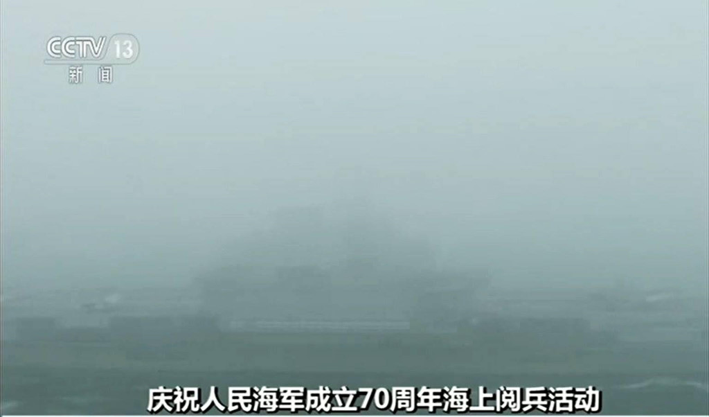 Tàu sân bay Liêu Ninh bị sương mù bao phủ không thể nhìn rõ tại cuộc diễu binh. Theo Reuters, hoạt động có sự tham gia của 32 tàu chiến và 39 máy bay Trung Quốc cùng tàu chiến đến từ 13 quốc gia. Tổng cộng 61 quốc gia cử phái đoàn đến dự sự kiện, gồm một hội nghị chuyên đề hải quân tổ chức vào ngày 24-25/4. Ảnh: CCTV13.