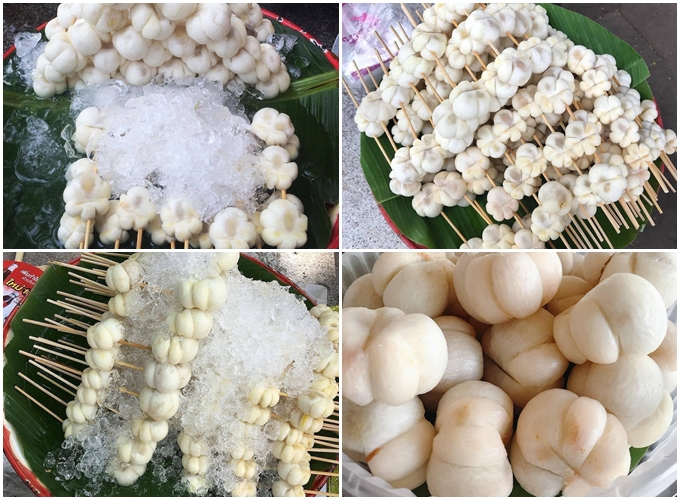 Món này được bán nhiều ở gần các ngôi chùa, thỉnh thoảng bạn cũng có thể bắt gặp từ những gánh hàng rong bán trái cây bên lề đường. Người ta lột vỏ sẵn, xiên thành que rồi ướp đá. Người bán thường chọn quả ngon nên chất lượng khá ổn. Múi của quả măng cụt vào mùa vừa to, hạt nhỏ nên ăn rất đã. Bạn có thể ăn không để tận hưởng trọn vẹn vị ngọt thanh của măng cụt, hoặc nếu gặp phải quả chua thì chấm với muối ớt Thái cũng thú vị không kém. Măng cụt chấm muối vừa tạo vị ngọt, vừa cay ăn lạ miệng.