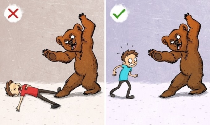 Nhiều người thường khuyên giả chết khi gặp gấu, tuy nhiên cách này cũng không đảm bảo bạn sẽ hoàn toàn thoát nạn. Thông thường, gấu không muốn tấn công con người. Vì vậy, trong hầu hết trường hợp, bạn chỉ cần lùi lại thật chậm, giữ liên lạc bằng mắt với gấu. Điều này sẽ cho con gấu biết rằng bạn không muốn xâm chiếm lãnh thổ của nó.