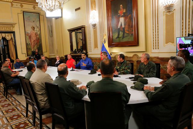 Tổng thống Maduro ngày 1/5 phát biểu trực tiếp trên truyền hình trong cuộc họp với các tướng lĩnh cấp cao của quân đội Venezuela sau cuộc đụng độ. (Ảnh: Reuters)