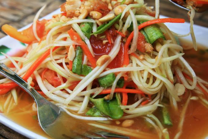 Nguyên liệu của món này gồm đu đủ bào sợi, ớt, tôm khô, cà chua, đậu đũa bẻ nhỏ. Tất cả được cho vào cối giã, sau đó thêm cốt chanh, nước mắm, đường thốt nốt rồi trộn cho gia vị thấm đều vào đu đủ. Vị cay đặc trưng của món ăn Thái sẽ khiến bạn cảm thấy kích thích. Giá mỗi phần Som Tam ở các xe đẩy rong chỉ khoảng 40 – 50 baht (khoảng 30.000 - 40.000 đồng). Ảnh: Shutterstock/Tom Grundy.