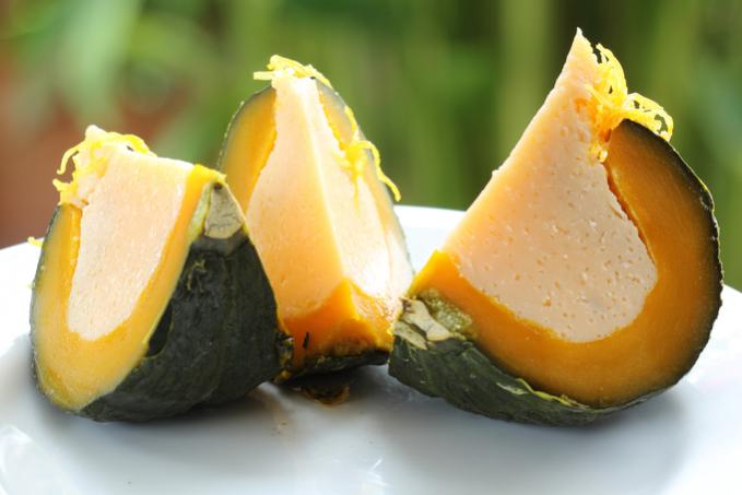 Để làm ra món này đòi hỏi đầu bếp phải thật khéo léo để nạo bỏ phần ruột bí mà không chạm đến phần thịt của quả. Kế đến, đầu bếp sẽ lấp đầy bên trong bằng nhân kem trứng mịn màng. Cả quả bí sau đó được cho vào nồi hấp tới chín. Món ăn có vị ngọt của bí ngô, vị béo thơm của kem trứng. Phần thịt bí sau khi chín có độ mềm, được chia ra thành nhiều miếng nhỏ bán với giá khoảng 50 baht (hơn 35.000 đồng) một miếng. Ảnh: Shutterstock/kungverylucky.