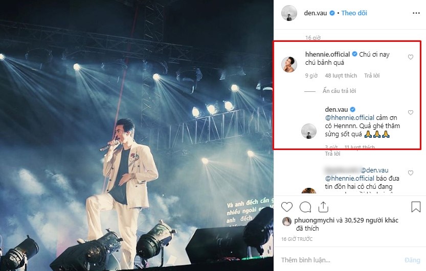 Sau khi hình ảnh và tin đồn hẹn hò lan truyền, NHM lại bắt gặp H’Hen bình luận trên Instagram của Đen Vâu. Không giấu giếm, người đẹp da nâu công khai khen ngợi: “Chú ơi nay chú bảnh quá”. Đáp lại lời hoa hậu, rapper gốc Quảng Ninh nói: “Cảm ơn cô Hen. Quả ghé thăm sửng sốt quá”.