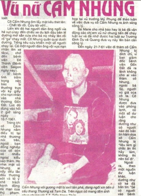 Vào năm 1963 tại Sài Gòn đã xảy ra 1 vụ đánh ghen kinh hoàng mà cho tới nay vẫn còn nhiều người nhớ. Nạn nhân là cô Nữ hoàng vũ trường Cẩm Nhung vô cùng xinh đẹp đã bị tấn công bằng a xít ngay trên đường phố. Dưới đây là toàn bộ nội dung của vụ việc...Cách đây hơn nửa thế kỷ, vào giữa năm 1963, tại Sài Gòn đã xảy ra một vụ đánh ghen được coi là rùng rợn nhất thành phố này. Đây cũng là lần đầu tiên ”Hoạn Thư” ở Sài Gòn biết sử dụng a-xít đậm đặc để thanh toán tình địch.